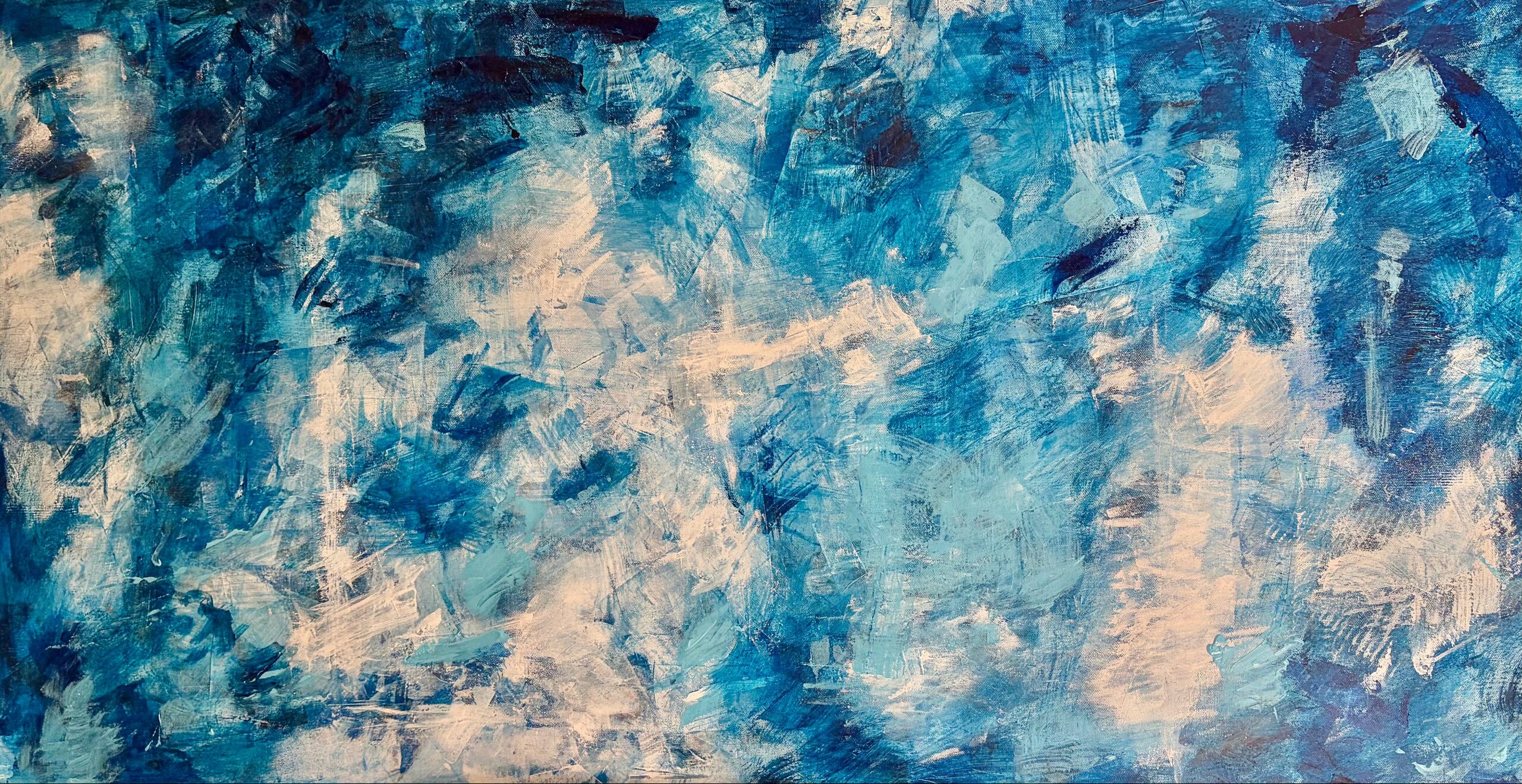 This piece goes all in on blue—layered, pushed around, softened, then pushed again. Some areas feel dense and heavy, others lighter and more open, like places where the water clears just enough to see down a little further. There’s no single focal point on purpose; your eye keeps moving, drifting, settling, then moving again. It’s less about what’s on the surface and more about that quiet pull underneath—the kind you feel before you realize you’ve stopped thinking and just started looking.