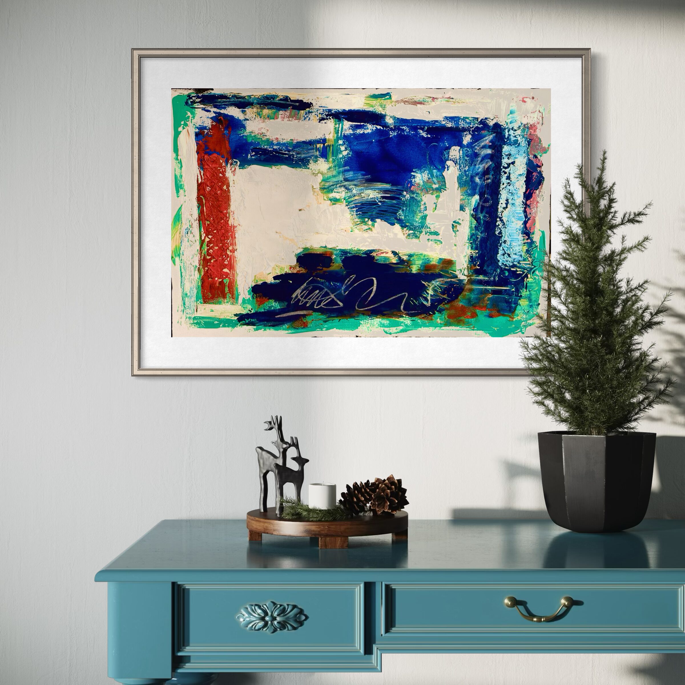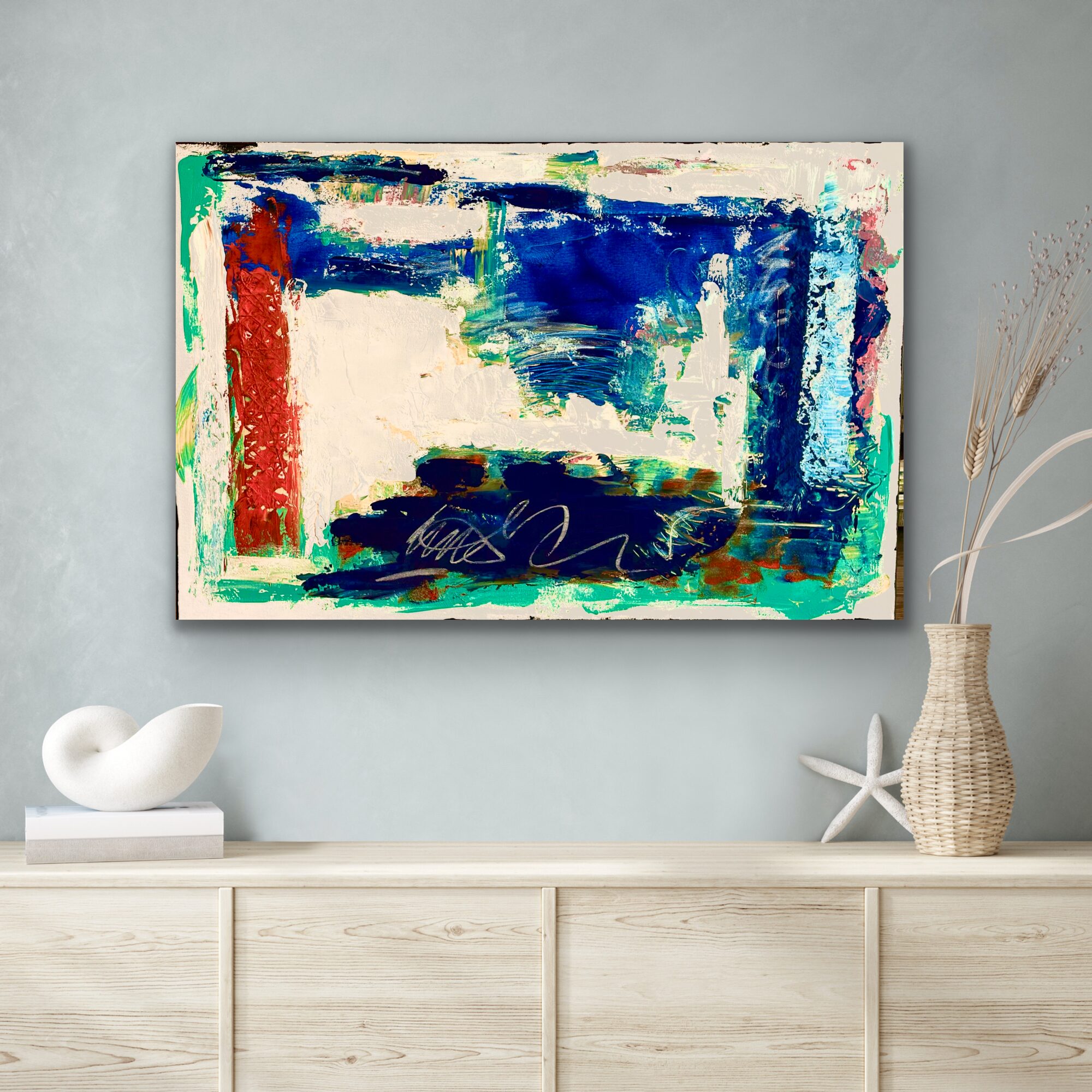 This contemporary abstract painting features layered acrylic textures in deep blues, turquoise, white, and red. Created through an intuitive, process-driven approach, the work balances structured negative space with expressive gestural marks. The painting explores themes of tension, revision, and visual rhythm, making it suitable for collectors of modern abstract art, contemporary interiors, and curated gallery exhibitions.