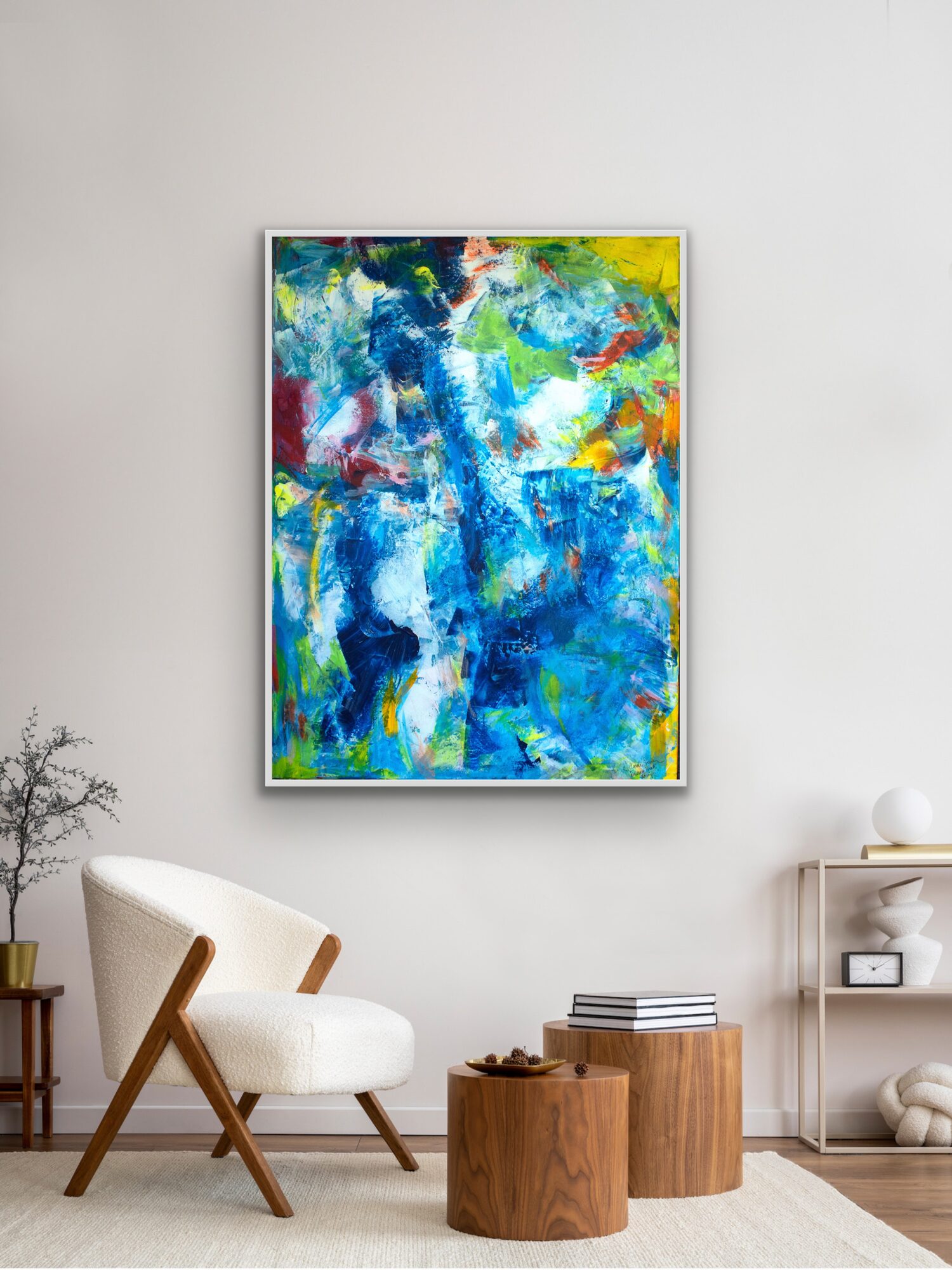 Energy is an expressive abstract painting that captures motion, force, and transformation through layered textures and sweeping gestures. Dominated by cool blues and whites with flashes of yellow and red, the composition suggests movement unfolding across the canvas. Thick palette-knife strokes and translucent layers create depth, allowing areas of light to emerge through turbulence. The painting invites viewers to experience the raw vitality of creative motion — a moment where chaos, color, and intuition collide to form something alive and evolving.