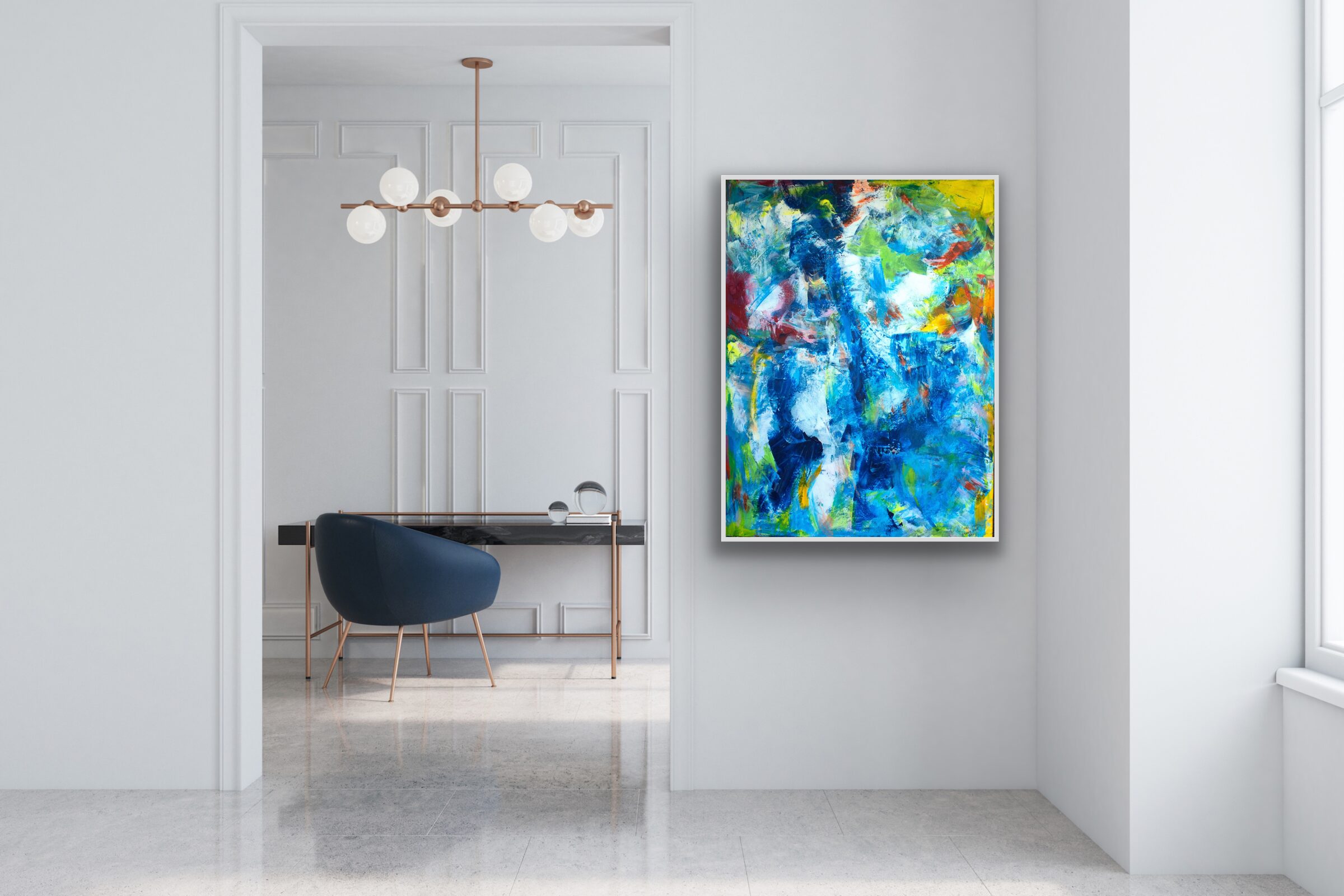 An energetic abstract painting with layered blues and vivid bursts of color, creating a sense of motion and fluid intensity.