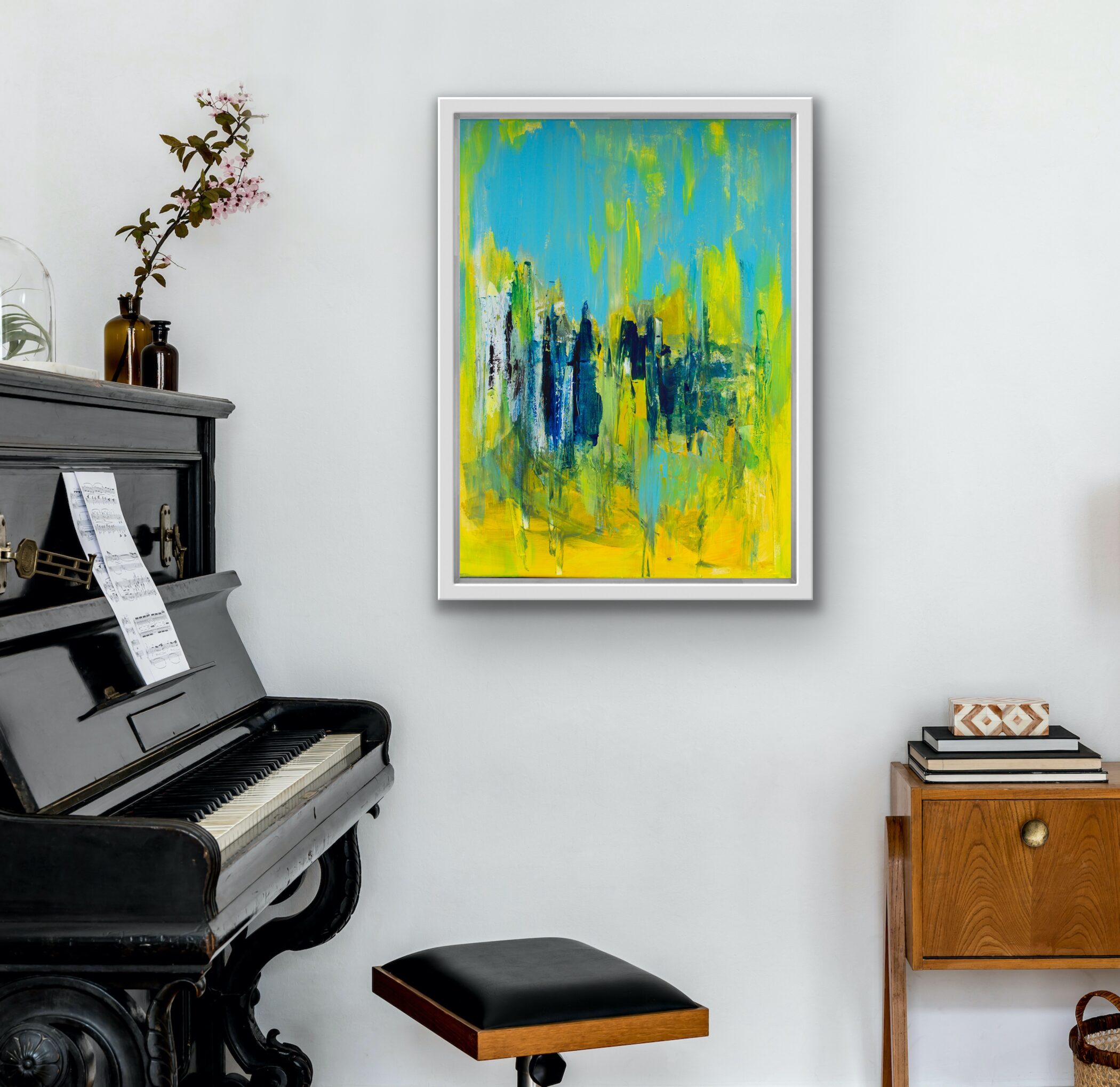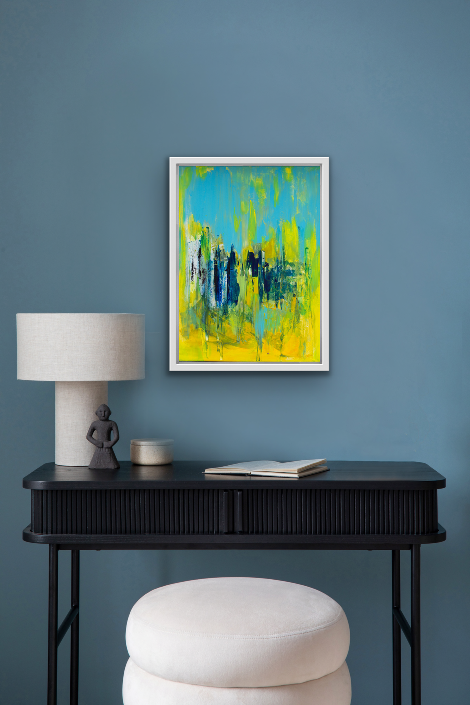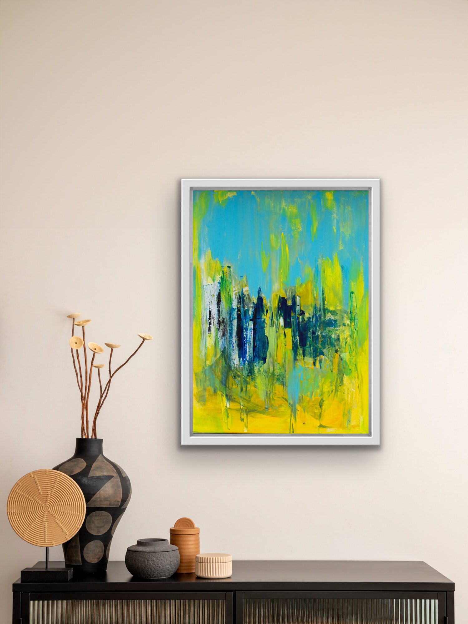 Keywords: abstract painting, yellow sky, garden painting, abstract garden, nature inspired art, contemporary abstract, expressive painting, gestural marks, layered painting, textured surface, luminous color, yellow and turquoise, green palette, atmospheric painting, abstract landscape, organic abstraction, modern art, intuitive painting, movement and light, rain inspired, garden after rain, wild garden, botanical feeling, emotional landscape, vertical composition, original artwork