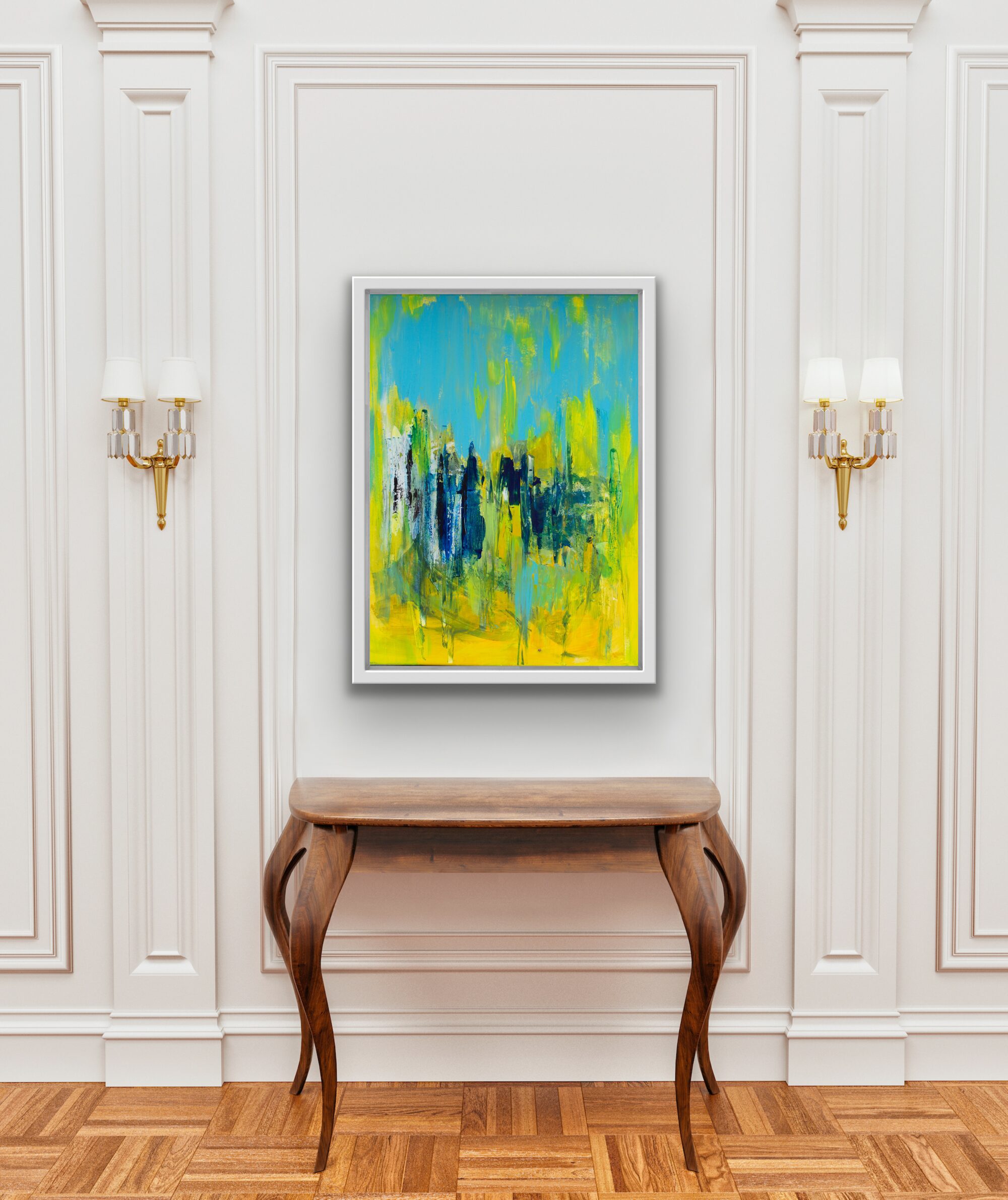 Where the garden Holds the Sky: is a contemporary abstract painting that evokes the feeling of a garden suspended in shifting light and weather. Layers of luminous yellow, turquoise, green, white, and deep blue move vertically across the surface, creating a sense of rainfall, growth, and atmosphere in motion. Gestural marks, drips, and textured passages suggest stems, shadows, and fragments of landscape without becoming literal, allowing the viewer to experience the work intuitively.